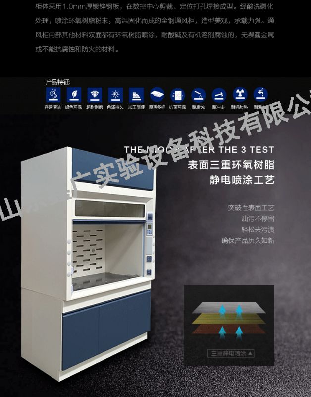 4、通風(fēng)柜正前方全部為玻璃視窗,有良好的可視范圍。擾流板和內(nèi)襯材料一致,擾流板支架由非金屬材料構(gòu)成。